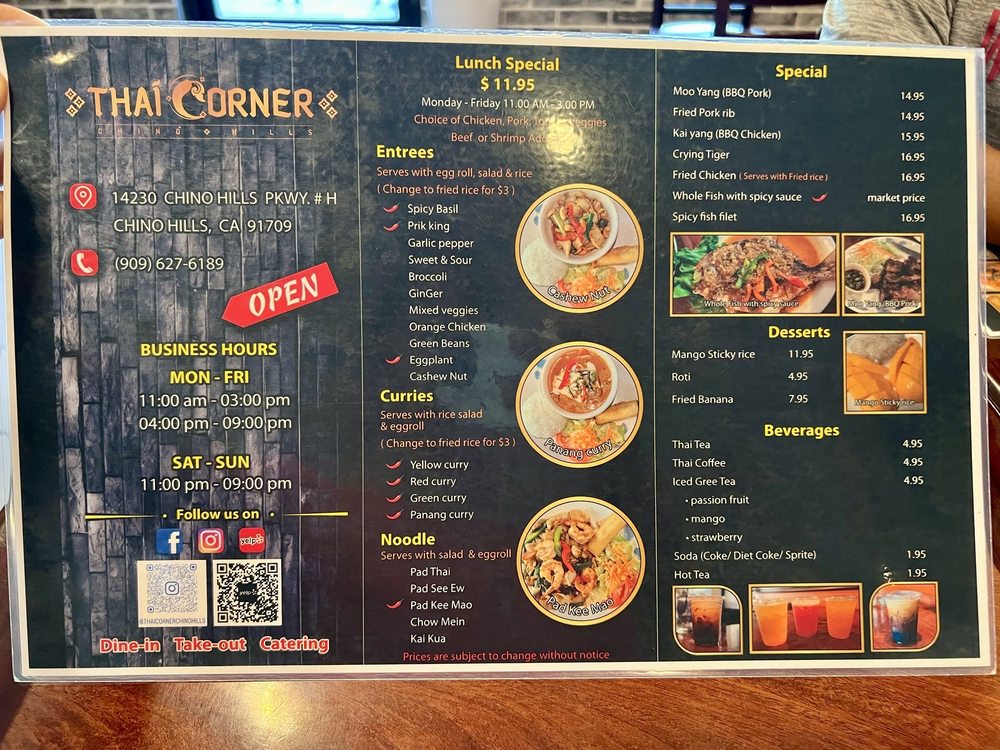 “ We are always satisfied with the food is delicious and goo portions. The service is good as well. Pommy is always kind and friendly and takes good care of us. I highly recommend Thai Corner next time you're in Chino Hills. ”